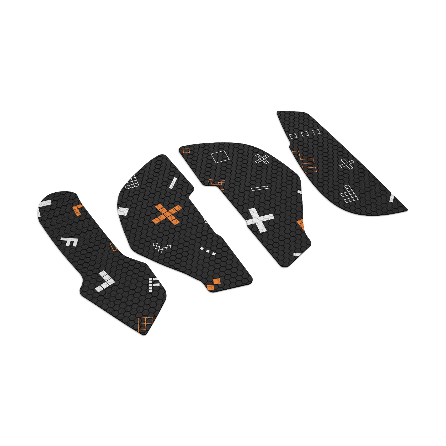 Каждый элемент набора тщательно подобран по форме и размеру, чтобы идеально соответствовать панелям вашей мыши. Ленты расположены в местах основного контакта ладони с поверхностью мыши, гарантируя максимальную надежность и удобство использования.